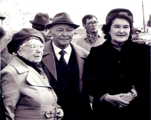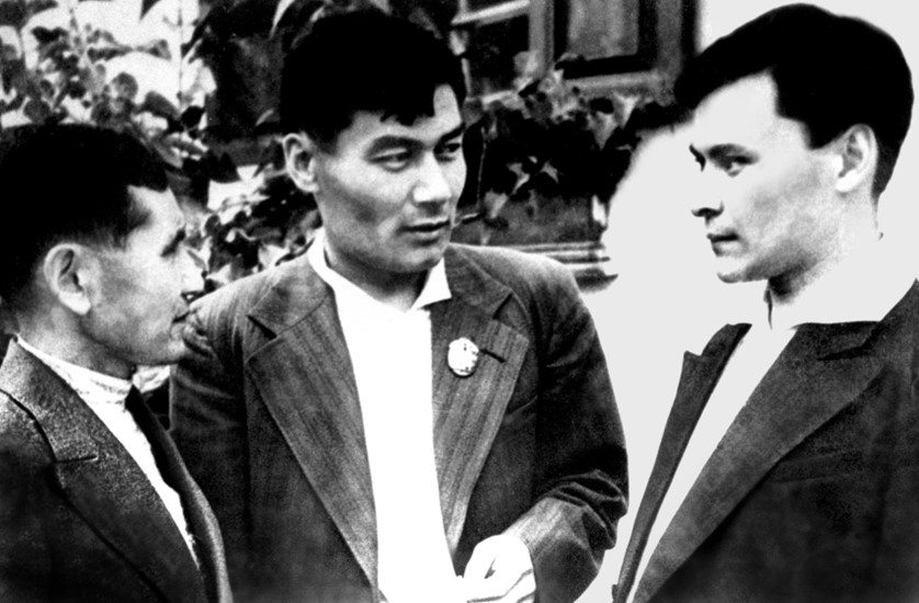 Оңңан оңға қарай: Зоя Кедрина, Қ. Мұхамедханов және Лейла Ауэзова.