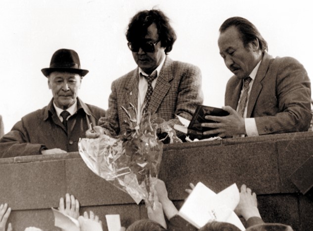 Қ.Мұхамедханов, О.Сүлейменовпен М.Магауин \\\"Невада-Семей\\\" антиядролық қозғаласы митингісінде, Семей қ., 1989 ж.