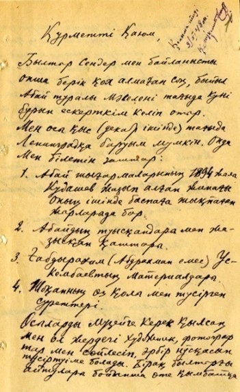 Әлкей Марғұланның Қ. Мұхамедхановқа жазған хаты,