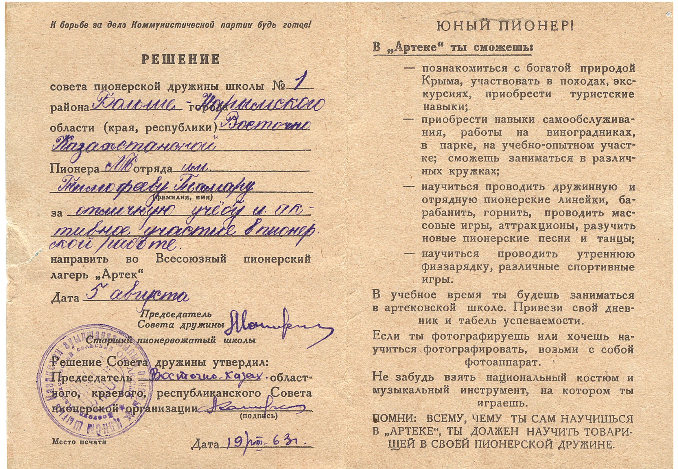 Направление во Всесоюзный ордена Трудового Красного Знамени пионерский лагерь «Артек» имени В.И.Ленина, 1963 г.